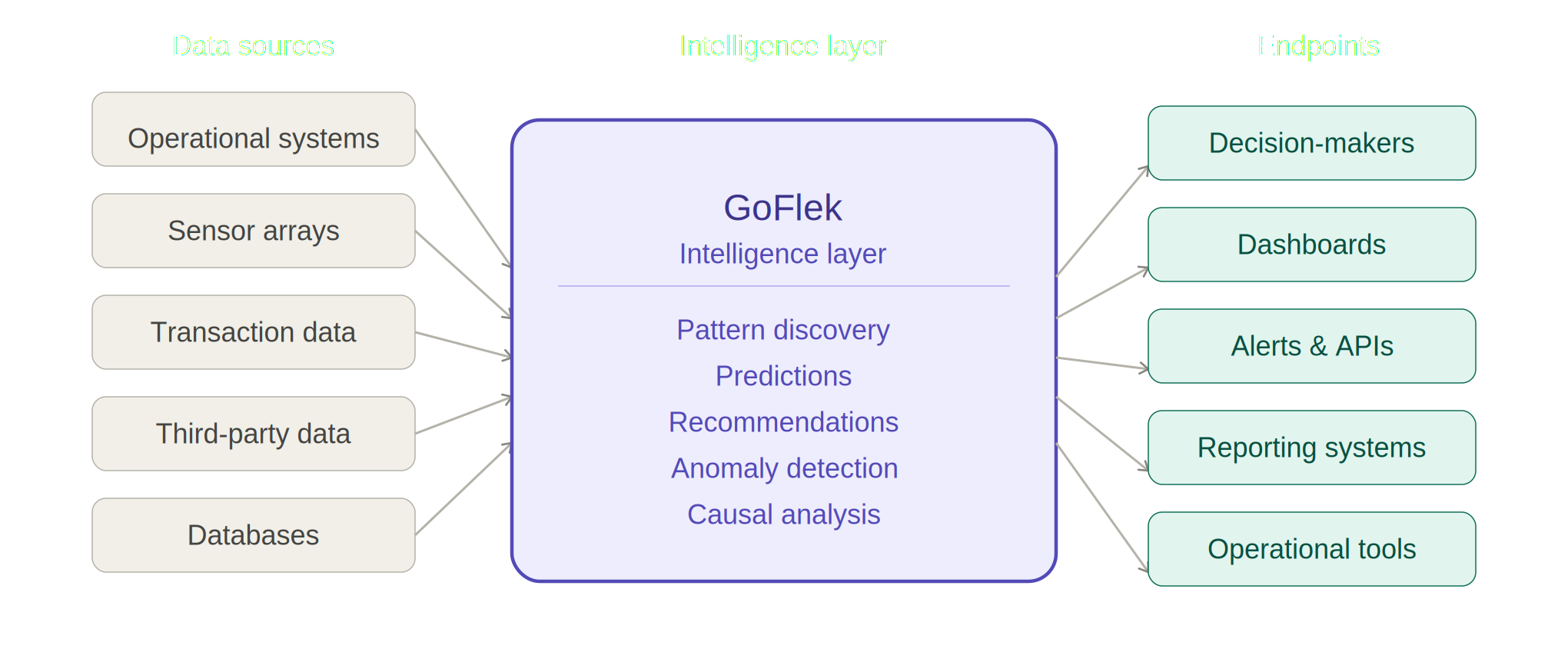 GoFlek's intelligence layer surfaces patterns, influences, and anomalies across datasets of any size, including combinations of variables that no conventional tool could have processed at once.